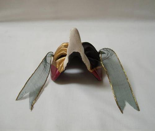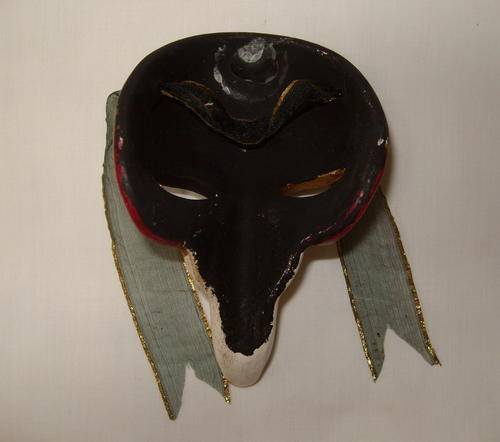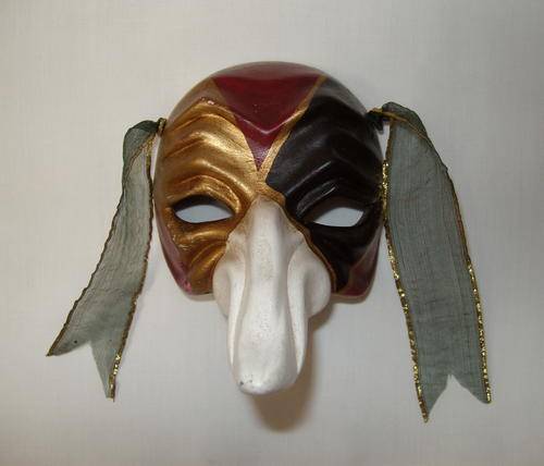 A burgundy, black, gold and white hand-painted ceramic wall mask,