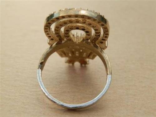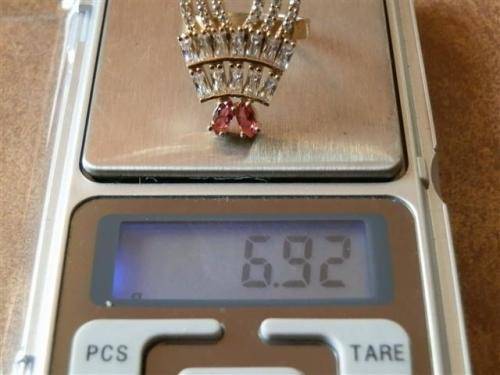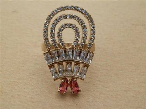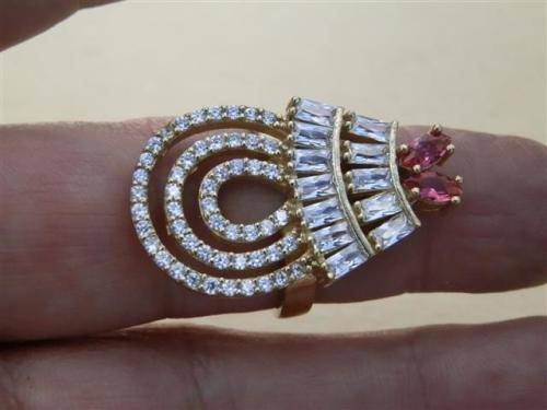 Alluring sterling silver ring with reddish and clear stones and bronze accent, marked 925 and in good as new condition.  The size is 19 mm, the top width 30 mm and the weight 6.92 g.  Fabulous!!