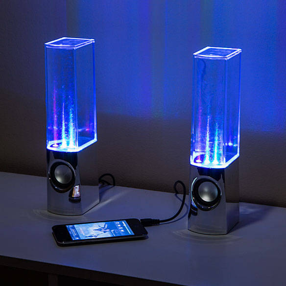 LED Water Dancing Speakers feature unique dancing water and lights show. The two USB-powered speakers have a black base, an exposed speaker and a clear plastic chamber where a water and light show dances to the beat of your music. Front-firing speakers push air into the plastic chamber and the four streams of water and multi-colored light react to the level of bass in your music. Features: