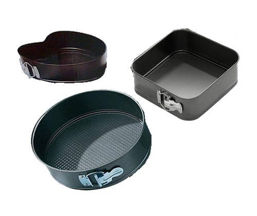 Spring Form Cake Pan Set Complete set pans are useful in kitchens, bakeries, and other food service operations The Spring Form Cake Pan is great for baking the perfectly rounded cake without a hassle Non-stick carbon steel with removable waffle-textured bottom makes for easy removal from the pan and has a heavy-duty quick release clip for easy product removal and easy clean up,