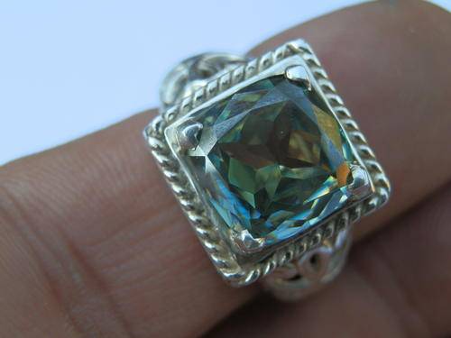 Stunning, beautifully decorated sterling silver ring, set with a 4.62 ct blue-green moissanite diamond, in good as new condition, size R / 9 with a head width of 14 mm and a weight of 8.5 g. The size of the diamond is 11 x 11 mm. The hardness of the stone test the same as natural diamonds on the diamond tester. Simply out of this world!