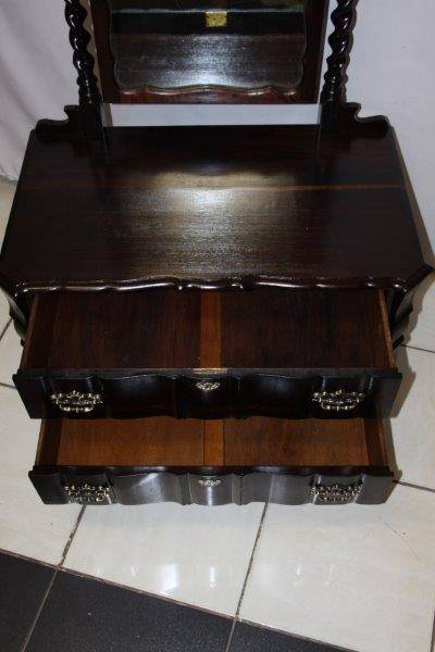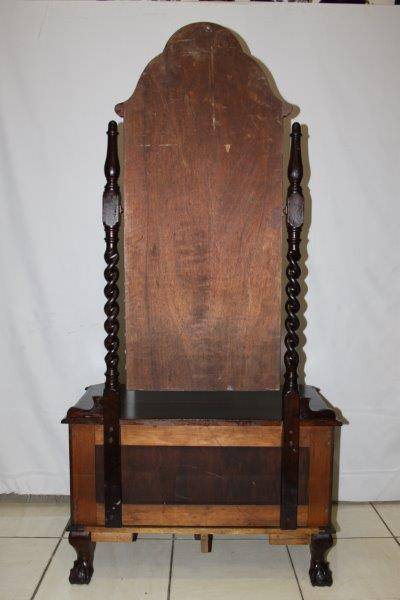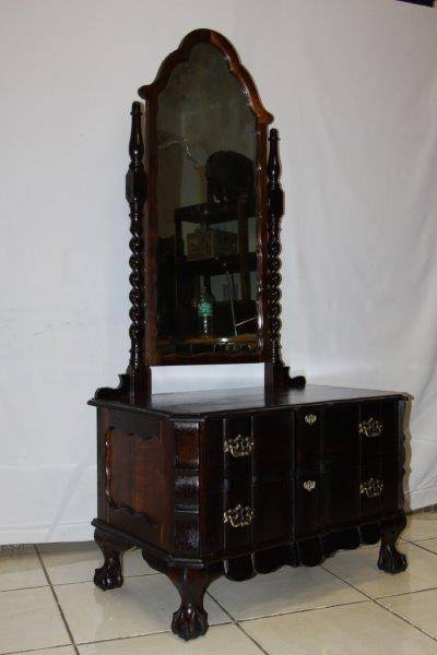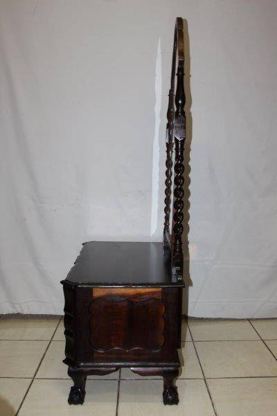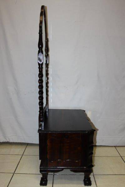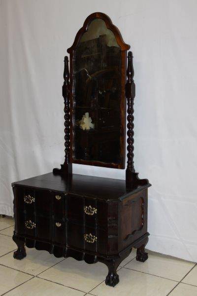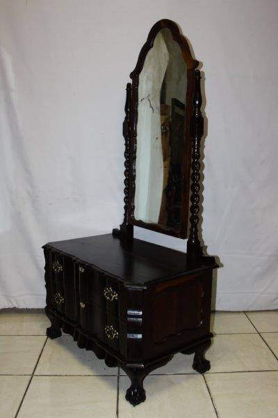 THIS SPECTAULAR SOLID HEAVY VINTAGE BALI TWIST BALL & CLAW CHEVAL MIRROR WITH 2 DRAWS IS IN A LEAGUE OF IT'S OWN!!! THE DETAIL AND FINISHING IS JUST MAGNIFICENT - A STUNNING GABLED MIRROR AND SOLID BRASS FITTINGS!!! UNFORTUNATLY THE MIRROR HAS SOME WEAR & TEAR BUT OBVIOUSLY THAT CAN BE REPLACED; THE REST IS IN EXCELLENT CONDITION!!! THE SIZE OF THE DRESSER IS APPROXIMATELY 880mm x 520mm x 1700mm HIGH! PLEASE VIEW THE PICS VERY CAREFULLY FOR MORE DETAIL TO APPRECIATE THIS STUNNINGLY BEAUTIFUL PIECE OF FURNITURE; WHAT YOU SEE IS WHAT YOU GET. POSTAGE WILL NOT BE POSSIBLE SO PLEASE COLLECT IN EDENVALE FREE OF CHARGE OR VIEW OUR SHIPPING OPTIONS! WE CAN COURIER ANYWHERE IN THE COUNTRY!