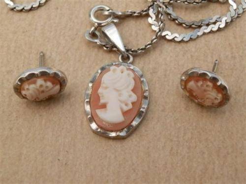 Gorgeous vintage sterling silver cameo set, all marked 925 and in good condition. The length of the chain is 40.4 cm, the size of the pendant 14 x 27 mm, size of the earrings 9 x 11 mm each and the total weight is 10.49 g. Awesome!!