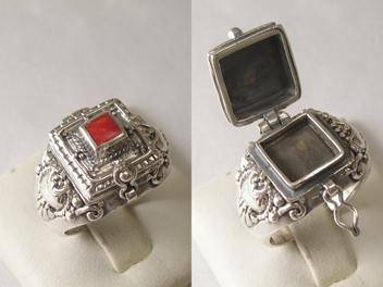 This is a very nice ornate sterling silver poison ring. The square shaped look likr red coral stone at the center of this ring is bezel set and surrounded by detailed work on the silver. It has a hinged compartment and the shoulders has more detailed work.