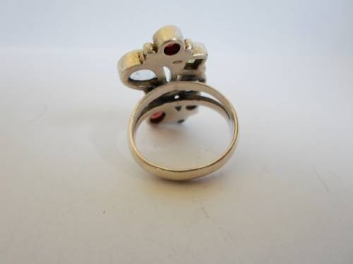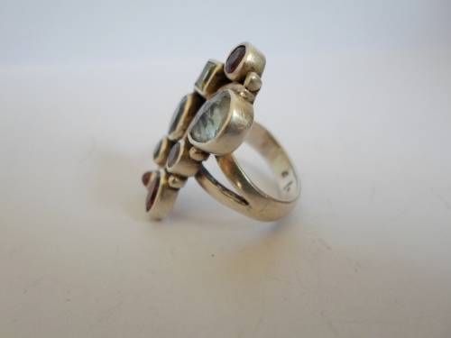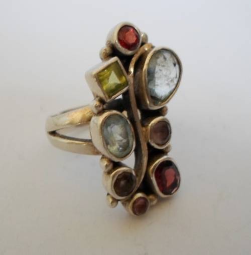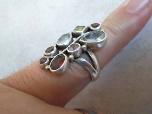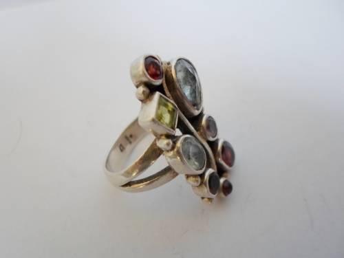 SPECTACULAR!! STERLING SILVER MULTI GEM RING, AQUA, AMETHYST, GARNET, PERIDOT SIZE P 9,1g WOW!