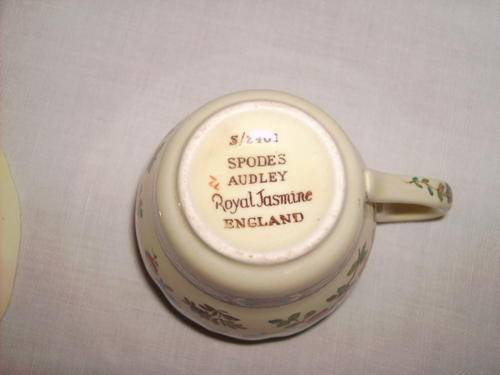 Spode's Audley Royal Jasmine coffee cup & saucer. Pattern S/2401, marked ENGLAND. Cup height 6.5cm. Painted with pink and blue flowers with turquoise rim