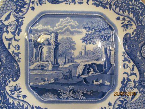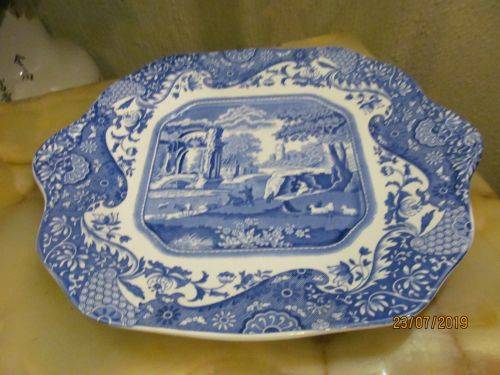 THE ITALIAN PATTERN DEPICTS A SCENIC LANDSCAPE PATTERN IN THE CENTER OF THE CAKE PLATE WITH A RUIN BESIDE A RIVER. THE RUIN IS CONSIDERED THAT OF THE GREAT BATH AT TIVOLI, NEAR ROME. THE ROW OF HOUSES IS A COMPOSITION TAKEN FROM LATIUM AREA NEAR UMBRIA NORTH OF ROME, AND ADDED, WHILE THE CASTLE IS TAKEN FROM THE PIEDMONT AREA AND LOMBARDY (This pattern is taken from sketches made by a traveling artist of scenes he encountered on his journey through Italy. SPODE used the sketches to create the pattern). THE SUCCESS OF THE SPODE ITALIAN PATTERN IS DUE TO ITS COMBINATION OF A CLASSICAL SCENE TOGETHER WITH A CHINESE INSPIRED FLORAL BORDER / VERGE.