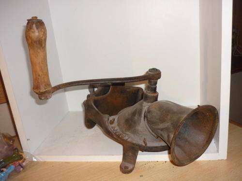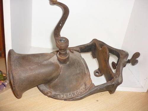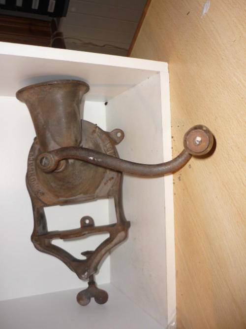 This coffee grinder is in working condition and completely unrestored.It is 39cm in length and has the original wooden handle. A wonderful piece of kitchenalia which can be restored with very little effort.One of the holding brackets has broken off,but this does not detract from the look of the grinder as that portion would be mounted to the wall by the other two brackets(see pics)