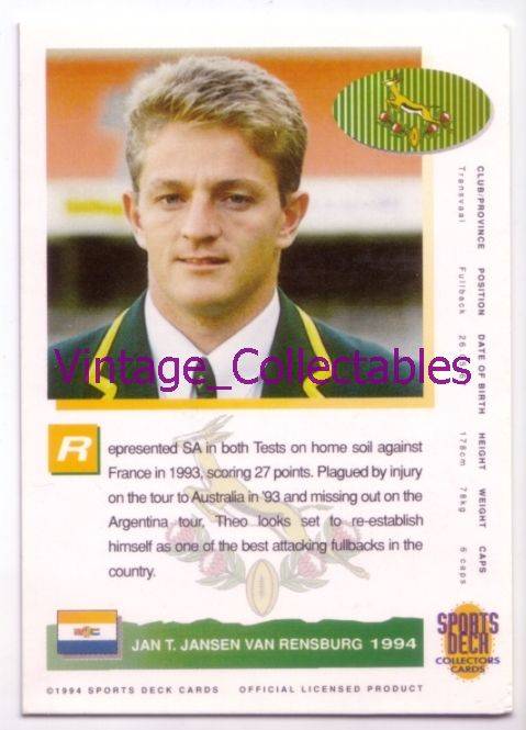 Springbok 1994 Rugby Trading Card - THEO VAN RENSBURG - 32/90