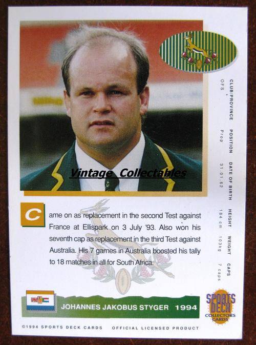 SPRINGBOKS 1994 Rugby Card - JOHAN STYGER - 3/90
