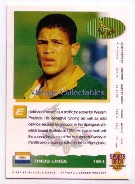 SPRINGBOKS 1994 Rugby Card - TINUS LINEE - 24/90