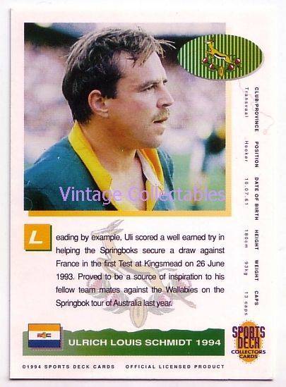 SPRINGBOKS 1994 Rugby Card - ULI SCHMIDT - 5/90