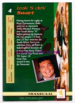 SPRINGBOKS 1996 Rugby Card - BALLIE SWART #04