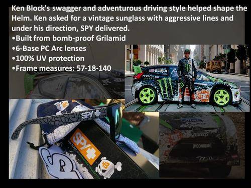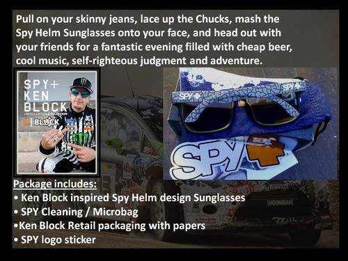 This brand new pair of SPY KEN BLOCK signature collection sunglasses is brand new. It comes in the original box with papers and SPY KEN BLOCK microbag and SPY LOGO sticker!