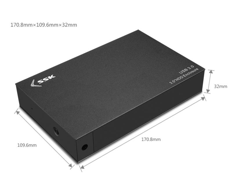 1. Brand: SSK 2. Model: HE-G3000 3. Item: 3.5inch HDD SSD Enclosure 4. Material: Aluminium alloy + ABS 5. Interface: USB 3.0, SATA 6. Transfer rate: 5Gbps 7. Dimension: 170.8 * 109.6 * 32mm 8. Supported systems: Windows XP/7/8, for MAC OS 8.6, Linux 2.4 and above