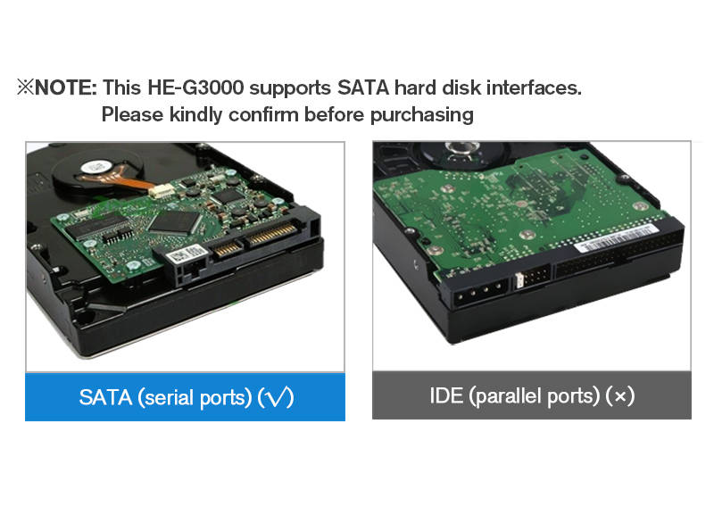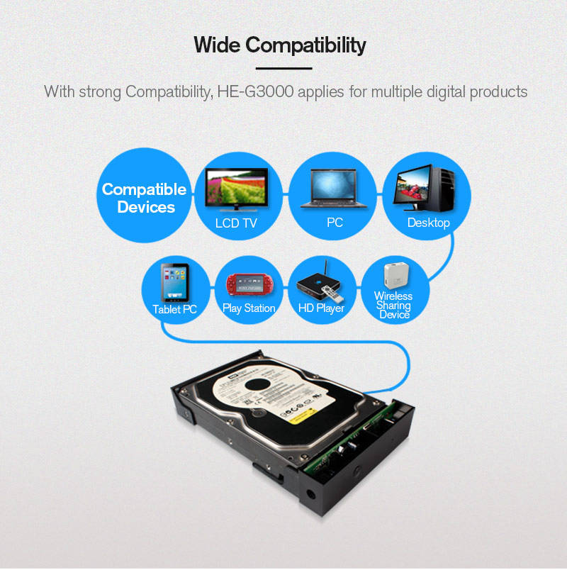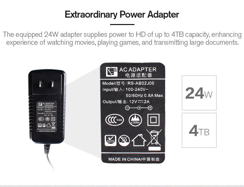 1. Supports 3.5inch SATA hard disks. 2. Transfers rate is up to 5Gbps. 3. With external power adapter, meets the power demand of driving a 4TB hard drive.