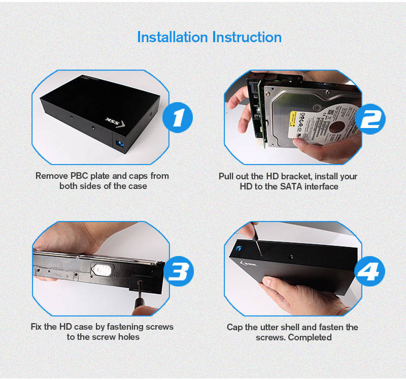1 * SSK HE-G3000 High Speed USB 3.0 to SATA 3.5inch HDD SSD Hard Drive Hard Disk Enclosure 1 * Power Adapter(US Plug) 1 * USB Cable