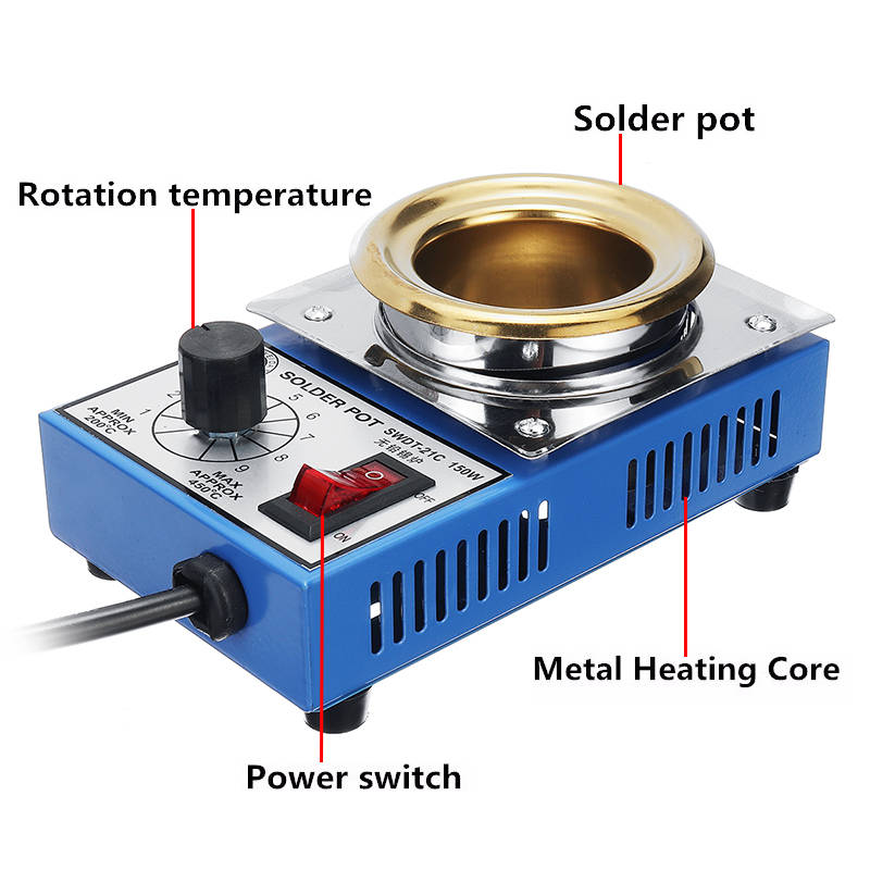 Power: 150w Input Vlotage: 220VAC Temperature: 200-450 a Melting Time: 5-15min Capacity: 500g Pot Diameter: 50mm Tin pot Material: imported stainless steel plate Note: According to the national distribution switching head Package Included: 1 x Desoldering Bath Titanium Plate
