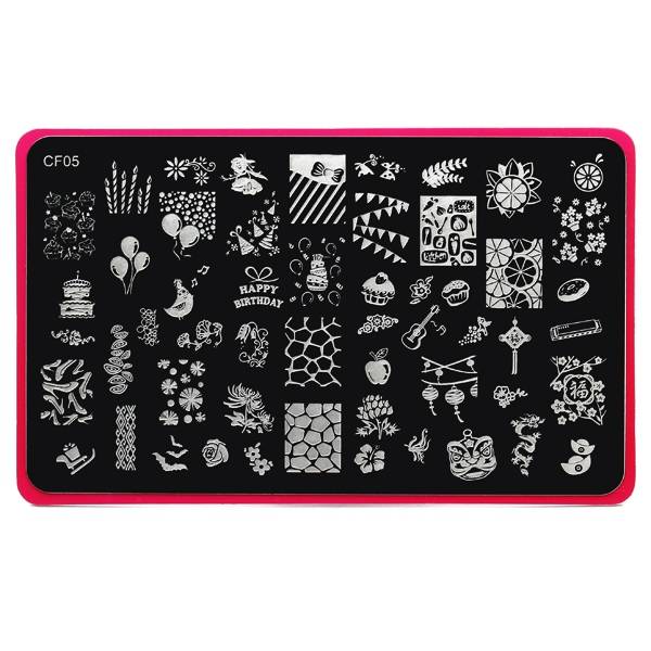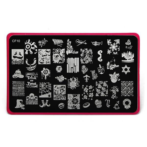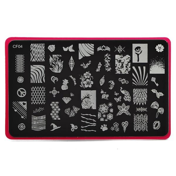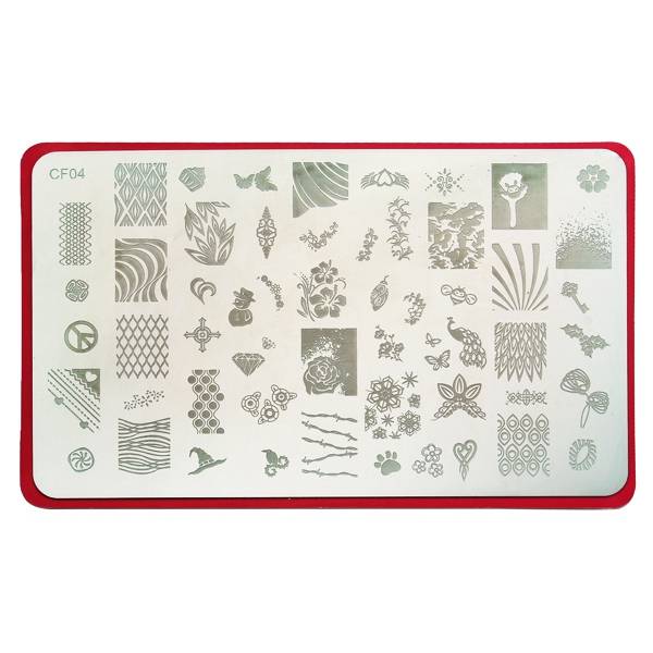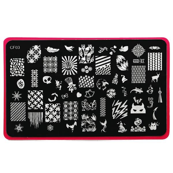 Stainless Manicure Nail Art Stamping Template Image Stamp Plate Description: Item Type: Nail Stamping Plate Style: CF03, CF04, CF05, CF10 (choose the one you like) Color: Silver Material: Steel Plate Size: About 15*9.5cm Weight: About 43g