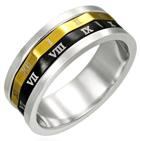 Stainless Steel 3-Tone Roman Numeral Double-Spinner Ring. Size 11