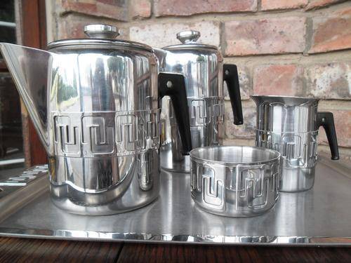 70,S ?? STAINLESS STEEL "ALOE" FIVE PIECE TEA AND COFFEE SET . HEIGHT OF COFFEE POT 18 CM TRAY 30CM X 39 CM ALL IN VERY GOOD CONDITION.postage R60