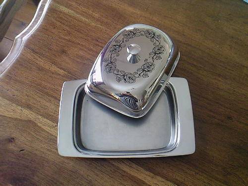 STAINLESS STEEL BUTTER DISH WITH ENGRAVED ROSES