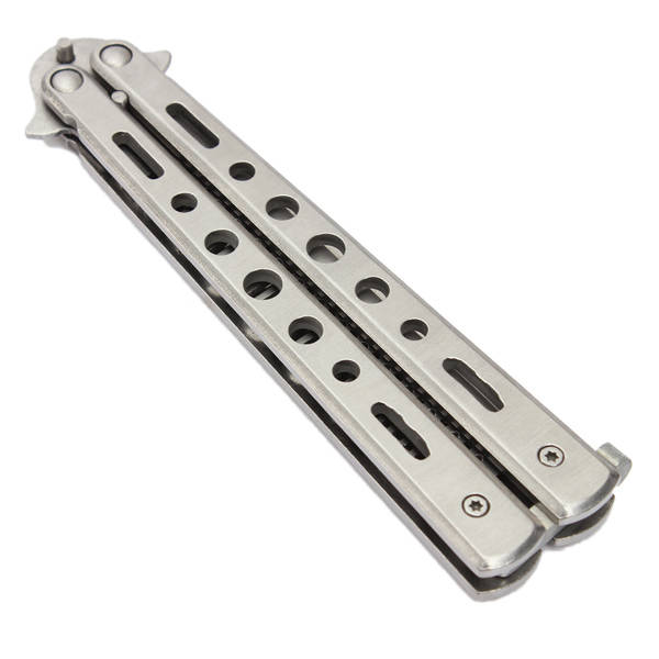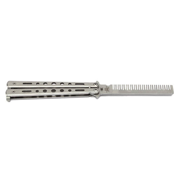 Features: Butterfly Style Steel Comb. All Metal Construction. You could practice it without danger. Description: Item Type: Practice Butterfly Comb Color: Silver-gray Material: Stainless Steel Whole Length: Approx. 22cm Handle Length: Approx. 12.2cm Weight: About 126g Package Included: 1 x Practice Butterfly Comb Notice: 1. Please keep the children away from this knife 2. This item is just for practice usage.