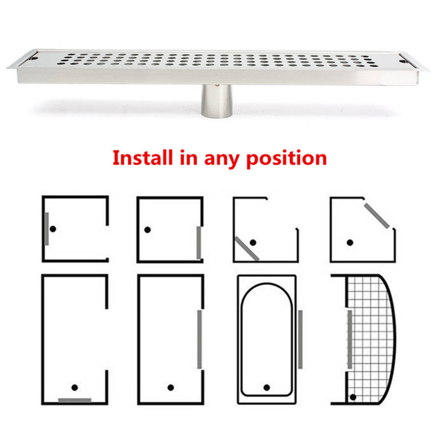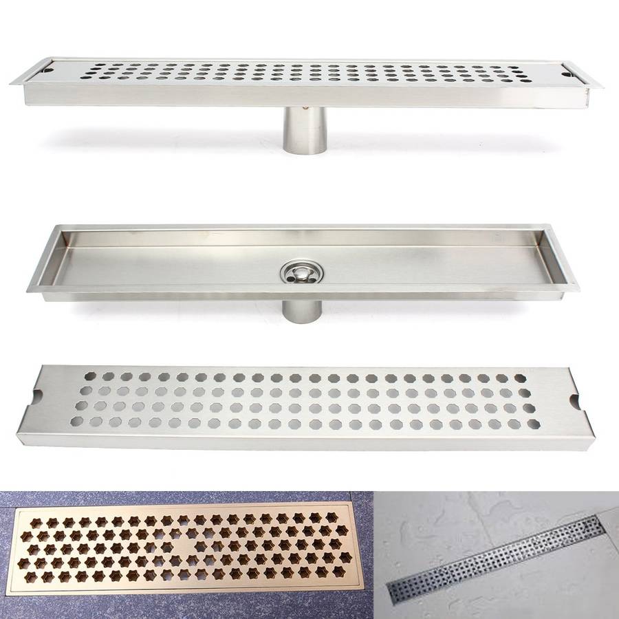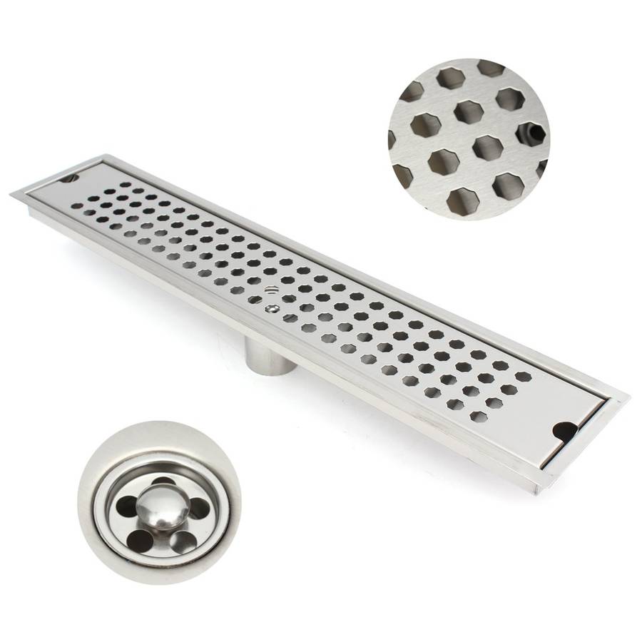 Features: Made of stainless steel material, durable in use. Linear drain with removable strainer. Large water outlet, fast without ponding. Used for toilet, kitchen, veranda & public drain area. Square hole filter design to prevent debris with obstruction. Prevent return water, backflow smelly, jams, pests and so on.