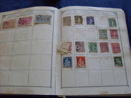 THIS STAMP ALBUM IS VERY OLD. BOOK SEEMS TO BE IN GOOD CONDITION, NO LOOSE OR TORN PAGES. SOME STAMPS ARE LOOSE INSIDE. ONLY THE STAMP COLLECTOR WILL VALUE THIS TREASURE!
