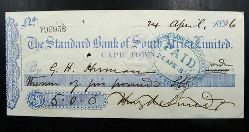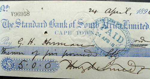 Standard Bank of South Africa Cheque. Cape Town. 24th April 1896