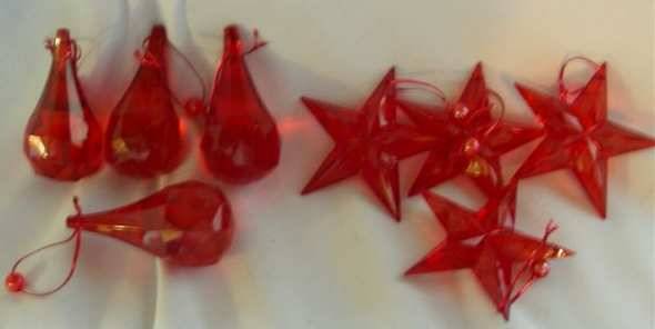 4 X RED STARS AND 4 X RED TEARDROPS - "crystal" decorations IN A WOODEN BOX, but they are plastic.