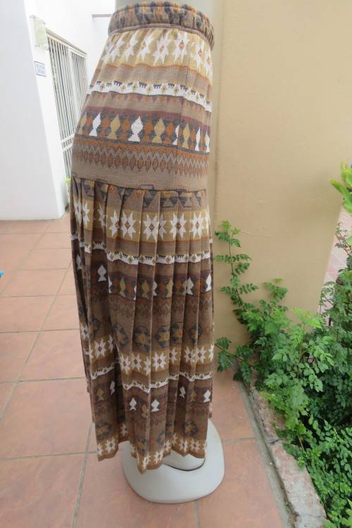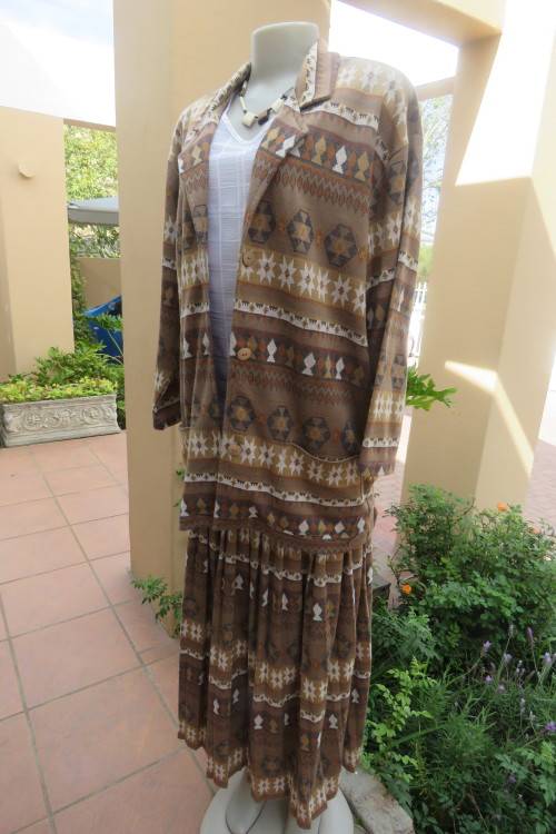 State of the art two piece vintage outfit by YAKIRA in size 36/12.In polyester/cotton fabric.Skirt and long jacket.Skirt with wide yoke and knife pleats.Long jacket with front pockets.Close with 3 buttons on front and open collar.In horizontal graphic print autumn colours.As new.