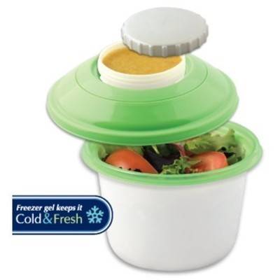 • Non-toxic freezer gel in lid keeps your salad & dressing cold