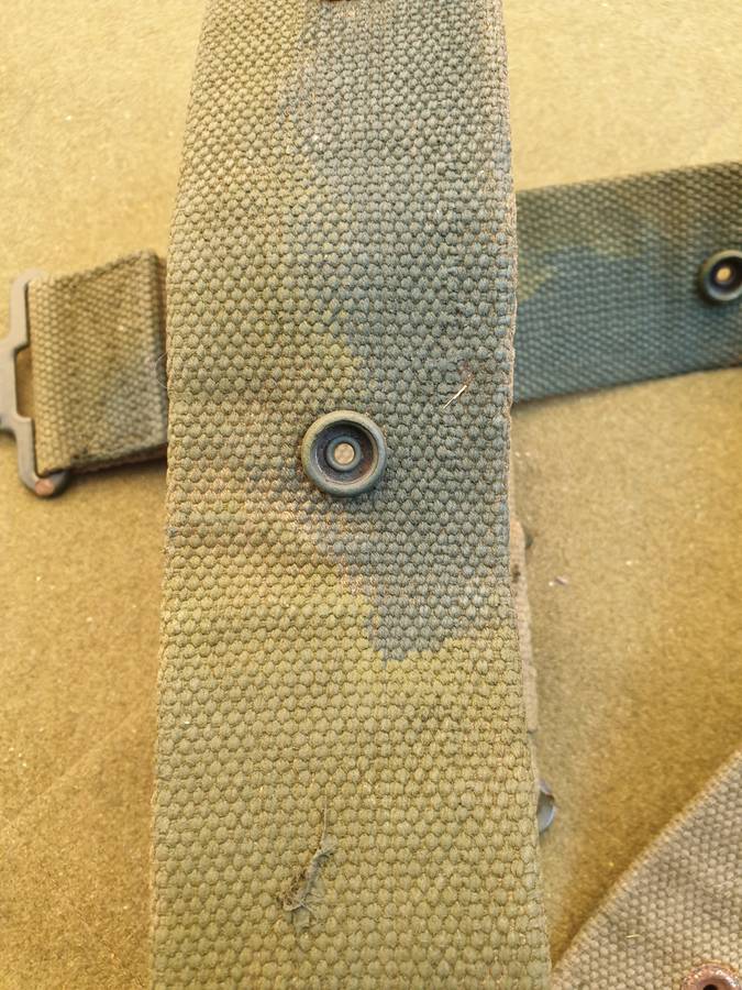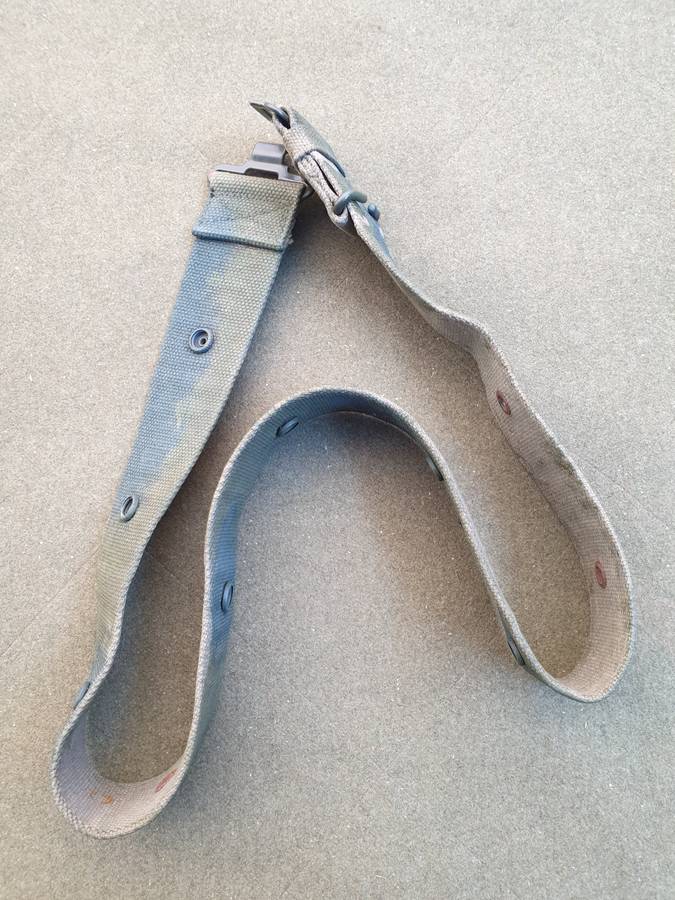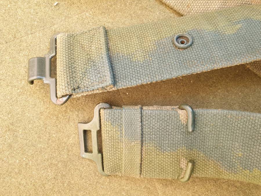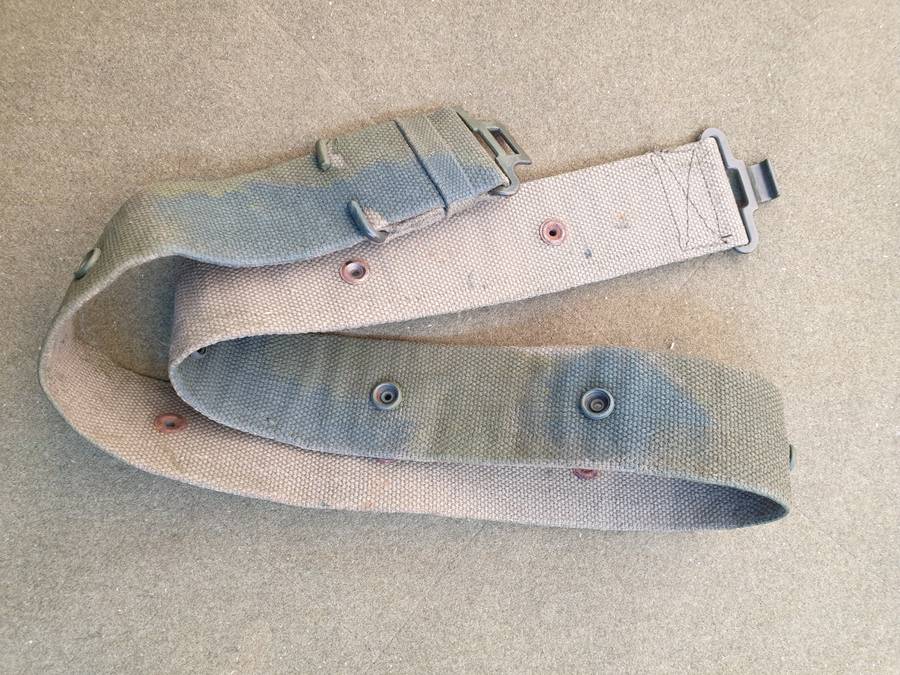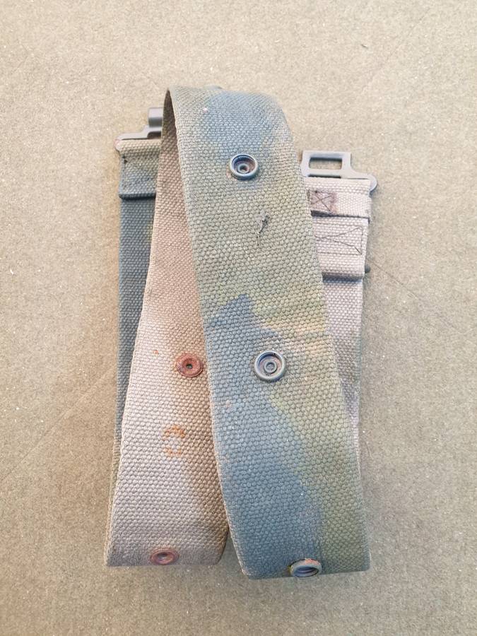 Here on auction we have a std type SADF era studded type patt 70/73 series web-belt custom two-colour camo painted - max waist size 42 inches - used condition with no damage & no fraying of the cotton canvas..