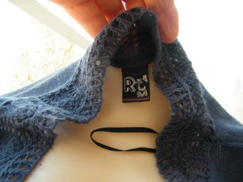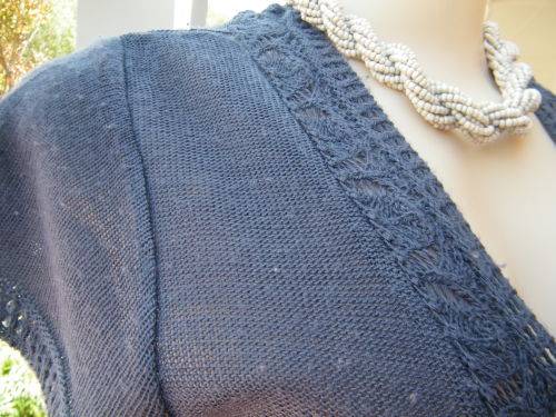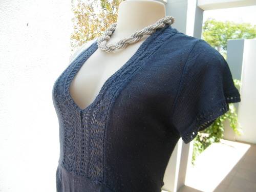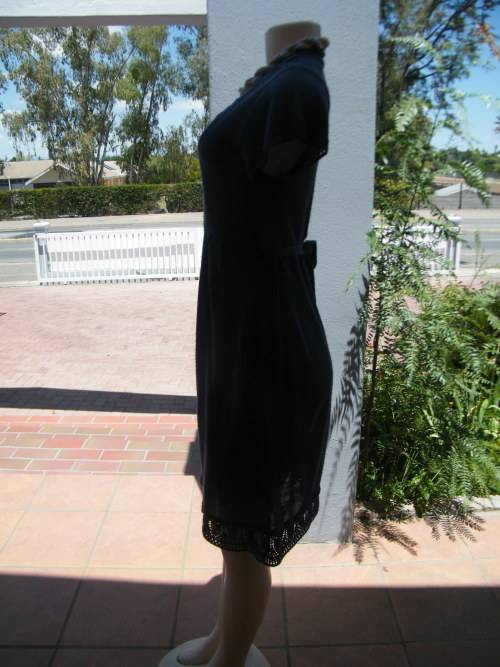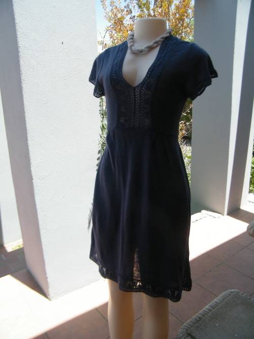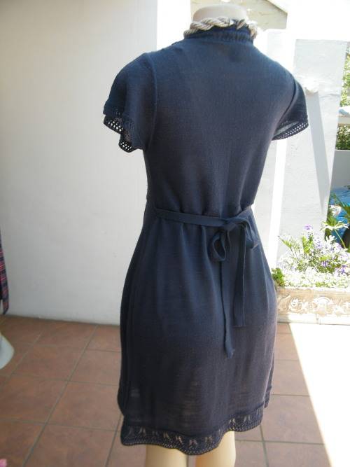 Steelblue acrylic knit short dress by RT in size 32/8 v front.Capped sleeves.Beautiful lace border.Straps in side toe tie at back.Used but fine for everyday wear.