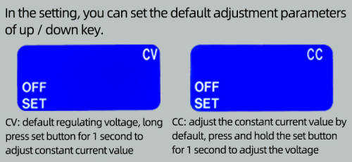 Press the UP/DOWN key briefly, and the voltage will be adjusted by default. Long press (fast increase / decrease) is supported.