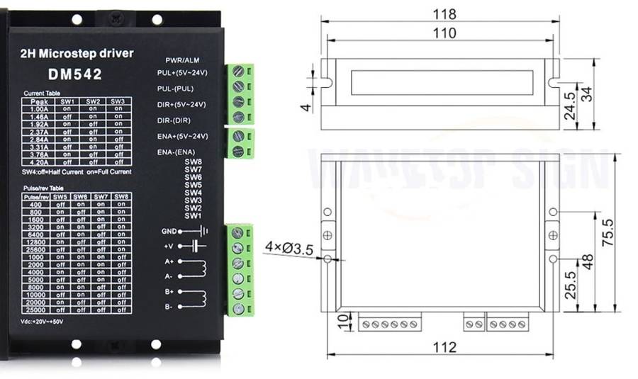 The DM542 is one of the best value-for-money hybrid stepping motor drivers on the market and is designed to drive bipolar hybrid stepper motors with outside diameters of between 42mm and 86mm at less than a 4.0A phase current. By utilizing a similar circuit to typical servo control methods, the DM542 runs smoothly at both high and low speeds — with little to no noise or vibration.