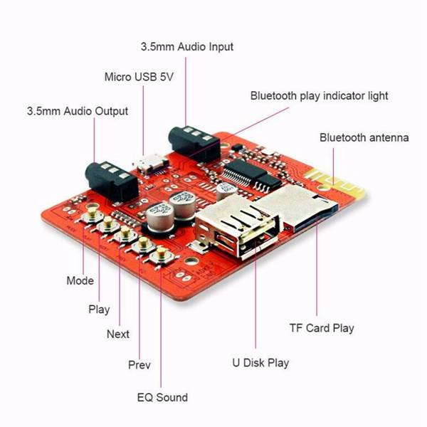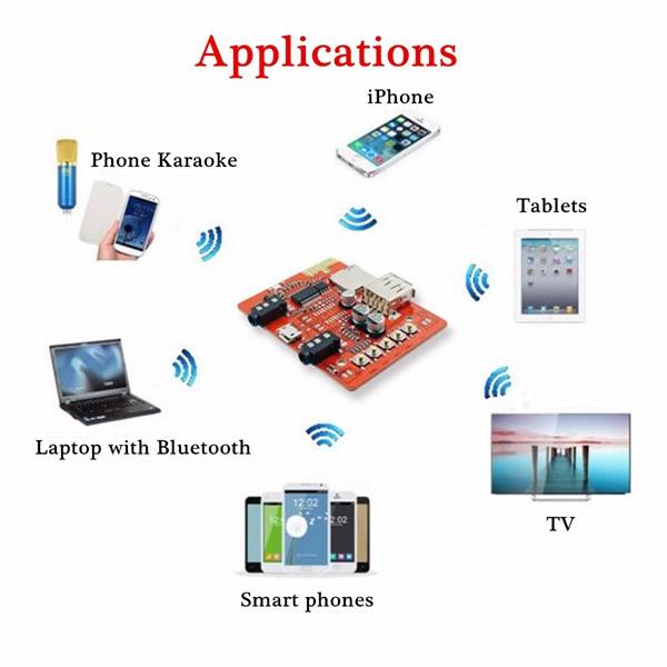 1. Used for DIY sound modification,can make your speaker and headphone upgrade to be high class Blutooth audio equipment with Wireless Bluetooth music receive 2. Support wireless Bluetooth audio receiving 3. Support USB and TF card play,support WMA/MP3/WAV decode 4. Support AUX input 5. With EQ sound effect function 6. Compatible for Bluetooth 3.0/4.0 and 4.1 version 7. Support HSP/HFP.Support Bluetooth hand-free call function 8. Support communication with Android APP through SPP protocol 9. Support L2CAP/A2DP(AVCTP/AVDTP/AVRCP) 10. Easy pairing, support automatically connect back, low power mode, sniff mode, stop mode 11. Size: 48mm x 60mm