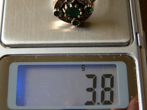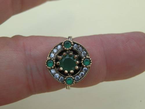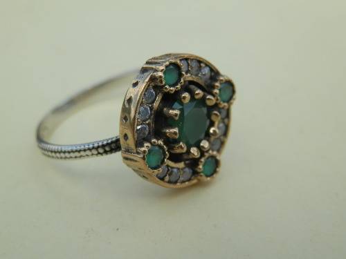 Sterling silver ring with bronze and clear stone accent, set with emerald green gems, marked 925 and in new condition. The size is O / 7.5, top width 14 mm and the weight 3.8 g. The size of the center stone is 5 mm diameter. This item was bought as a emerald and topaz ring.