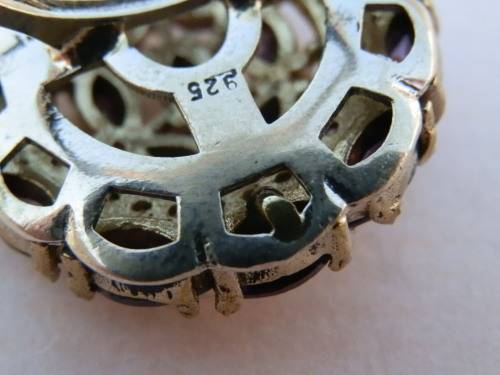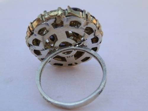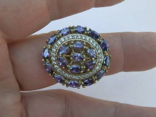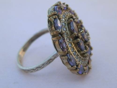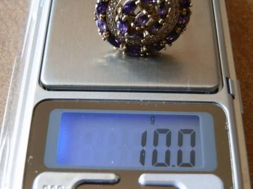 Gorgeous sterling silver amethyst ring with bronze accent, marked 925 and in new condition. The size is S / 9.5, top width 28 mm and the weight 10 g. Not sure whether the stones are natural.