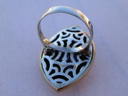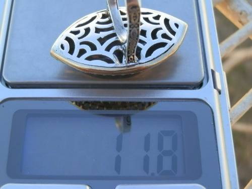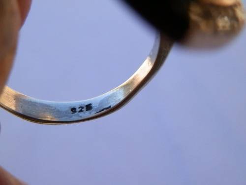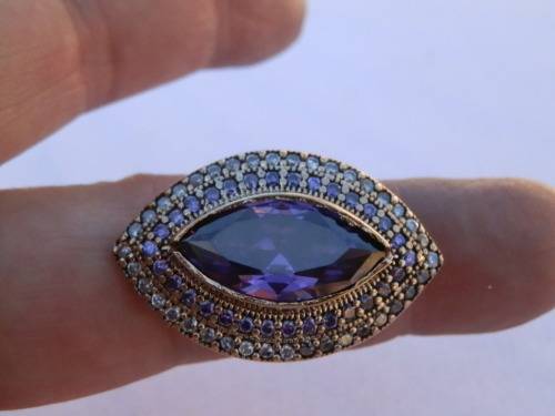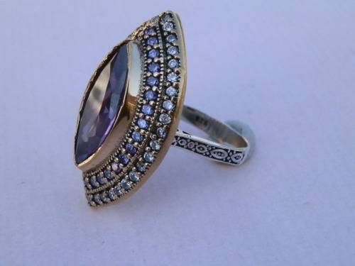 Sterling silver amethyst ring with bronze accent, marked 925 and in good condition. The size is Q / 8.5, top width 34 mm and the weight 11.8 g. The size of the large stone is 9 x 20 mm and although the item was bought as a amethyst and topaz ring, I can not guarantee that the stones are natural.