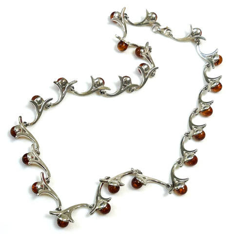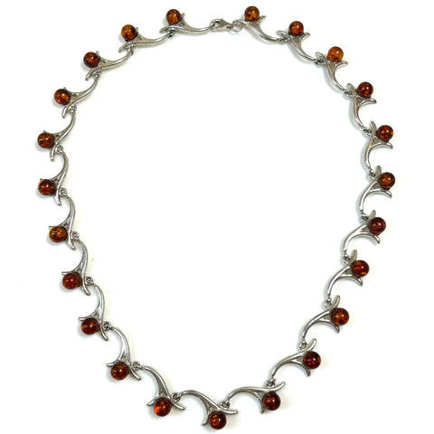 The modern, sterling silver necklace is made up of 23 silver links and a dog-clip closure. The silver links are in the form of a stylised flower with a deep honey coloured amber bead (6mm diameter; all with some inclusions) set onto them. The clasp is marked "925" for sterling grade silver.