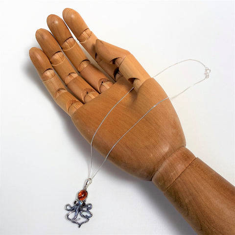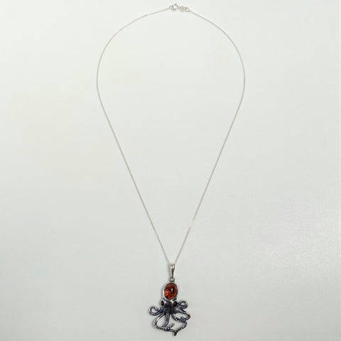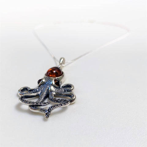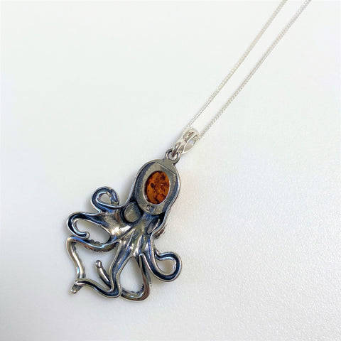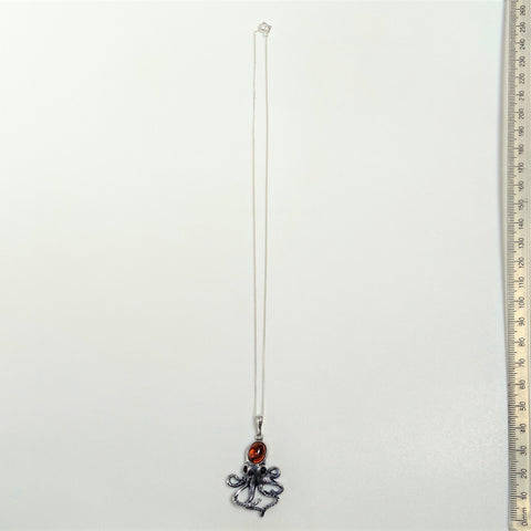 The modern, sterling silver octopus pendant has a small fixed ring and hinged figure of eight bale. The body of the pendant has fine bead and fine applied ring decoration and is rub-over set with amber in the body (10.0mm x 7.5mm oval, dark honey-coloured with inclusions) and eyes (3mm diameter dark honey-coloured). The pendant hangs from a fine curb chain. The pendant, bale and the chain are marked 925. The chain is also marked Italy and has a further mark resembling a three-leaf clover.