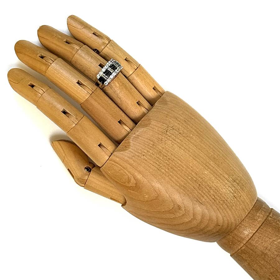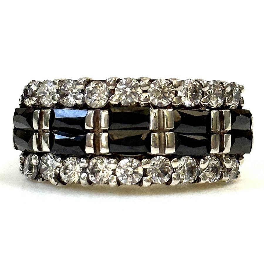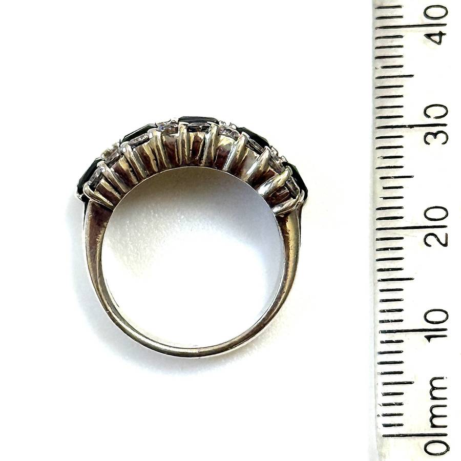 The sterling silver dress ring is set with cubic zirconia. The ring is stamped "925" for sterling silver.