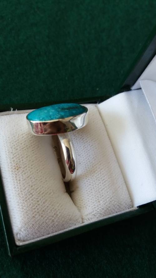 Up for auction is a sterling silver and turquoise ring in good condition. The stone is not completely oval and there is a hairline on the stone but I think it's a natural one but I'm not sure. The head measures approx 2cm x 1.6cm, the inner diameter is 18mm and weighs approx 7.9g. Please look at the pictures as they form part of the description. Payment to be made by Monday after close of auction. Thanks for looking