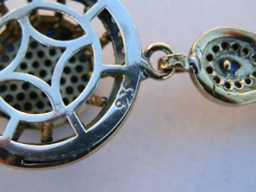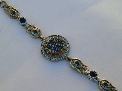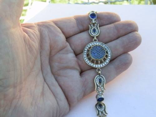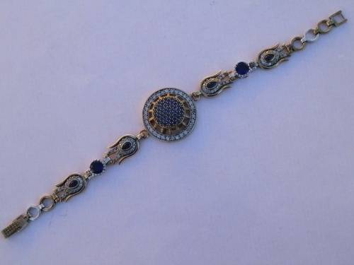 Sterling silver blue sapphire and topaz bracelet, marked 925 and in new condition. The length is 19.5 cm, top width 25 cm and the weight 20 g. The hardness of all the teardrop blue stones is that of blue sapphire, not the round ones.