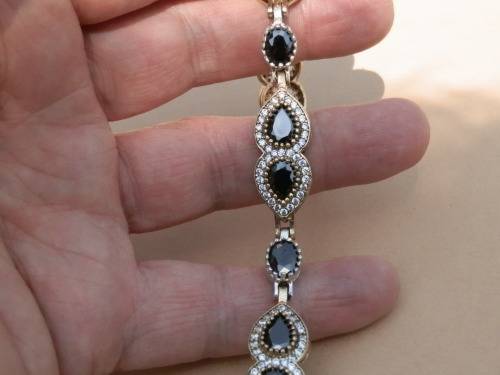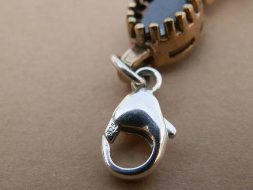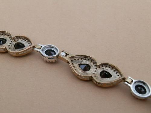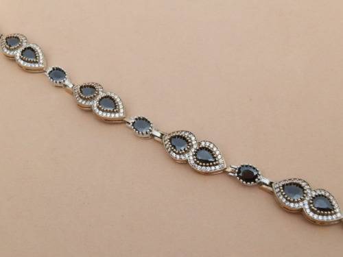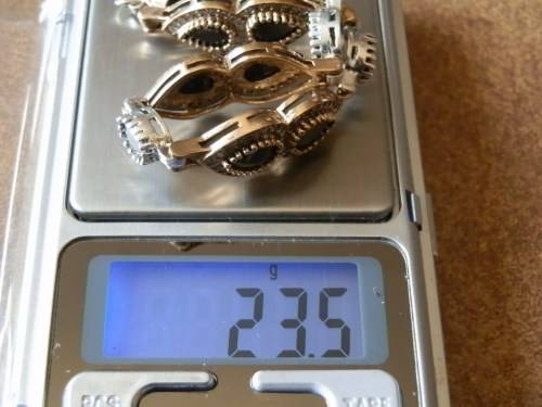 Sterling silver bracelet with bronze accent, set with clear and dark stones, marked 925 and in good condition. The length is 21 cm, width 6 to 12 mm and the weight 23.5 g.