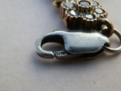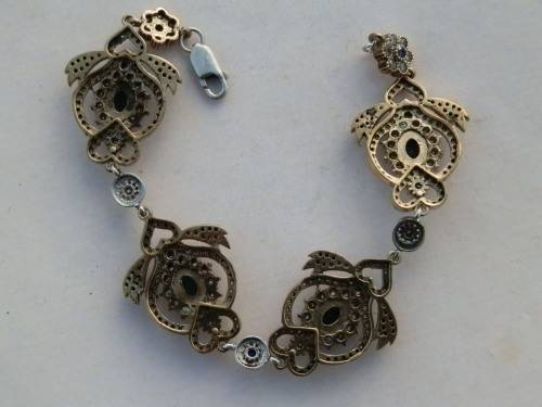 Beautiful sterling silver bracelet with bronze accent and set with blue and clear stones, marked 925 and in good condition. The length is 22 cm, width 0.7 to 25 mm and the weight 31.5 g. Size of the large blue stones is 6 x 8 mm each.