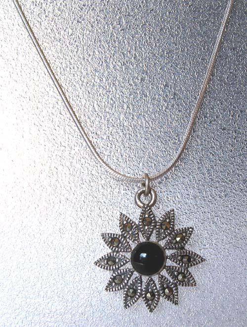 This is a lovely sterling silver chain - black onyx and marcasite pendant. What a beauty!