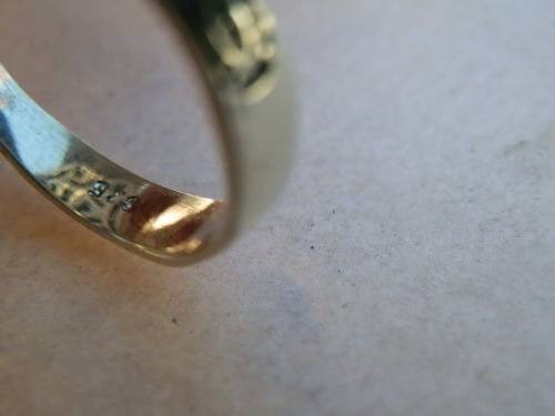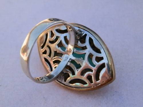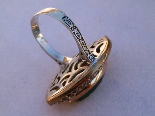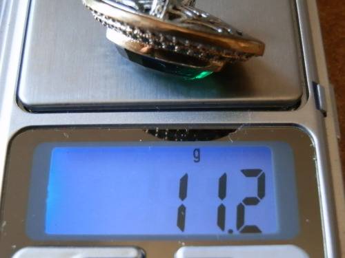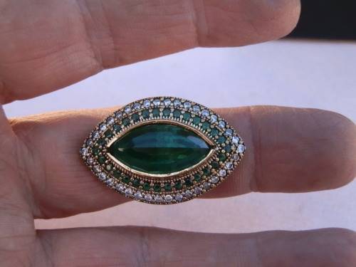 Sterling silver emerald ring with bronze accent, marked 925 and in good as new condition. The size is Q / 8.5, top width 32 mm and the weight 11.2 g. The size of the center stone is 10 x 20 mm and none of the stones are guaranteed as natural.